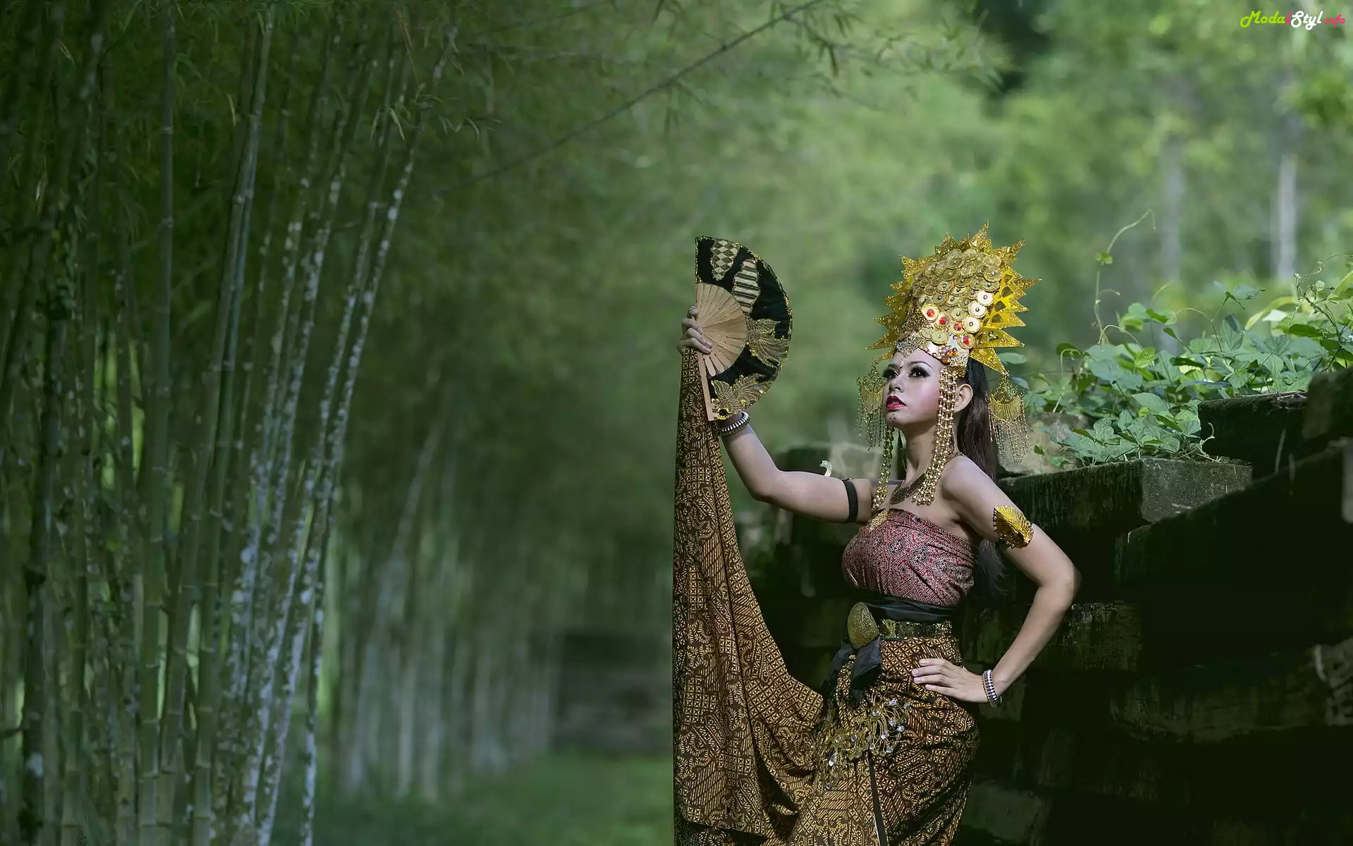 Brunetka, Moda, Styl, Orientalny, Wachlarz, Las, Moda i Styl