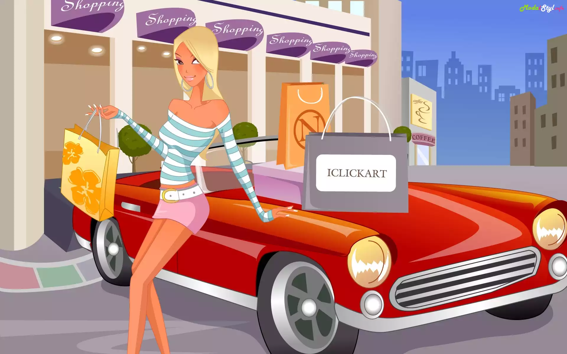 Grafika, Domy, Blondynka, Czerwony, Samochód, Zakupy, Moda i Styl