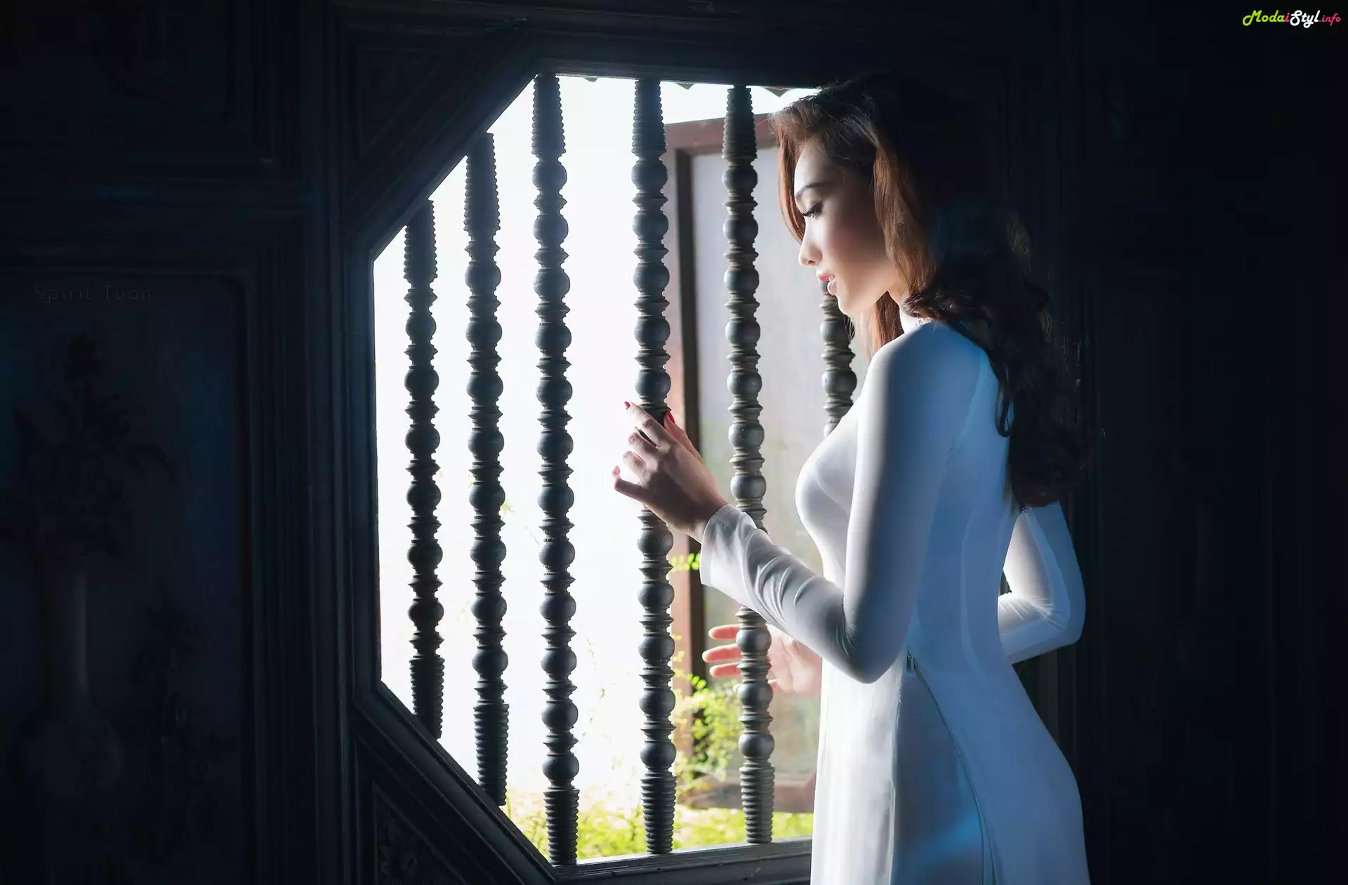 Kobieta, Brunetka, Azjatka, Biała, Sukienka, Okno, Moda i Styl