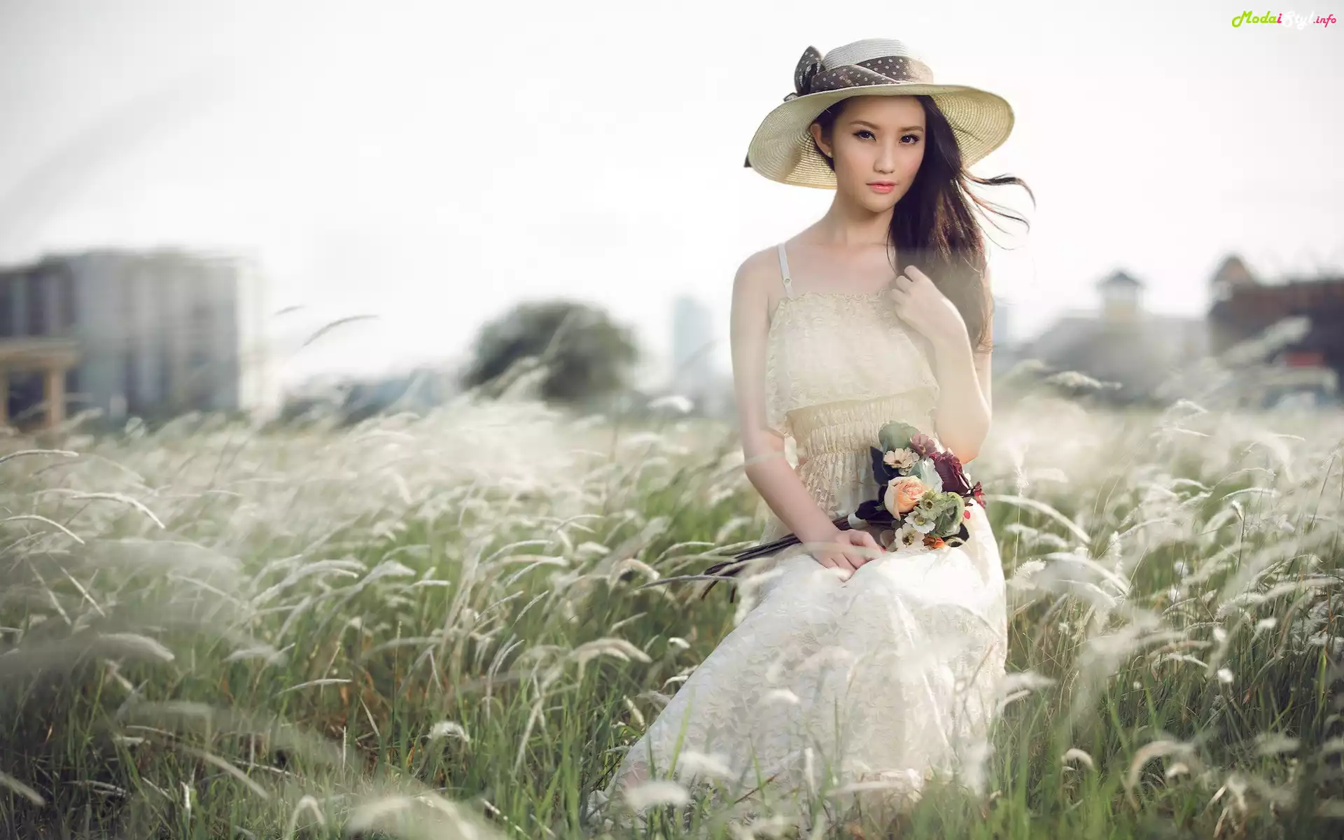 Brunetka, Moda, Styl, Kapelusz, Bukiet, Kwiatów, Łąka, Trawa, Moda i Styl