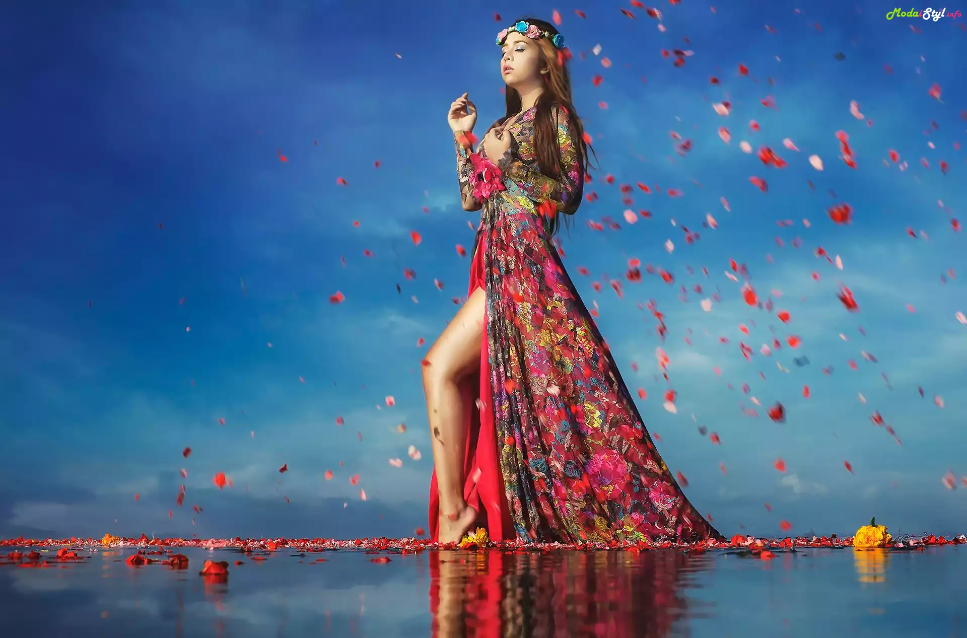 Brunetka, Kwiecista, Sukienka, Moda, Wianek, Woda, Płatki, Kwiatów, Woda